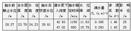 當(dāng)時(1988年11月)靜止水位為28.27m.根據(jù)以上地質(zhì)資料分析可以認(rèn)為,在靜止水位以下的礫石層和砂礫層、砂土含礫層都是含水層,巖石風(fēng)化帶為另一個含水層。同時也可以認(rèn)為,由靜止水位以下到穩(wěn)定基巖以上為1個含水層。