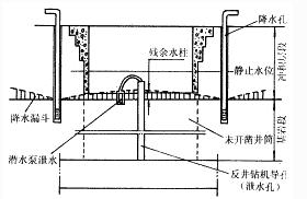 采用降水法鑿井最大的難題是降水后期的殘余水柱。能否消除殘余水柱是十分關(guān)鍵的問題,過去曾采用過增加降水孔的方法。這種方法不但加大工程成本,而且只是減少殘余水柱的高度,不能徹底消除。另外,也曾采取過增加降水孔深度的方法,這種方法也不奏效。