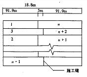 考慮到每條水泥混凝土188.8m長,中間會產(chǎn)生溫度收縮裂縫,因此在每條水泥混凝土中間附近設施工縫,縫內(nèi)放傳力桿,相鄰兩條水泥混凝土施工縫交錯布置,間距為5m.水泥混凝土用跳格澆筑法,即隔一條水泥混凝土澆筑另一條水泥混凝土,28天后再逐條將空格的水泥混凝土澆筑補齊。