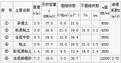 地處福建漳州市鬧市區(qū)的某工程,高20層,框架剪力墻結(jié)構(gòu),地下室兩層,開挖深度8.5m(承臺(tái)深度9.5m),基坑占地面積45×37㎡,場地西、北約4.0—5.0m外均為居民住宅樓,高1—4層,淺基,磚混結(jié)構(gòu),場地東側(cè)6m外為某銀行,高5層,天然地基,框架結(jié)構(gòu),場地南側(cè)為街道,街道邊埋設(shè)有地下管線,環(huán)境條件對(duì)基坑開挖要求高。場地土層及主要物理力學(xué)性質(zhì)及其它有關(guān)設(shè)計(jì)計(jì)算指標(biāo)見表1。