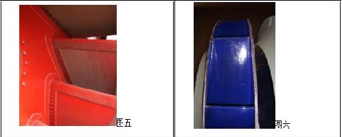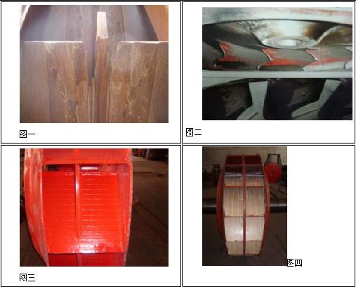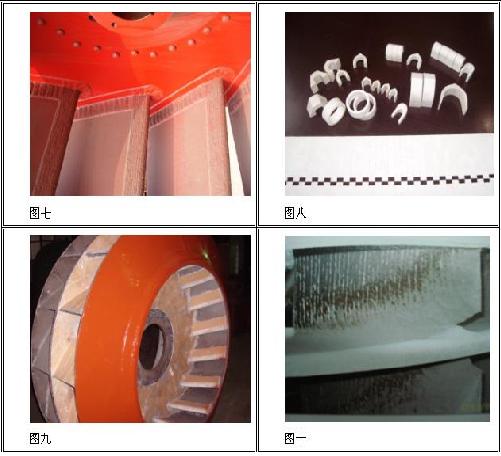 2.3水泥磨系統(tǒng)循環(huán)風(fēng)機(jī)使用工況90-110度左右,粉塵濃度較高,但粗顆粒含量相對(duì)較少。因此瓷片不易發(fā)生沖擊破裂。針對(duì)葉片與墻板根部易磨損,葉輪制造時(shí)根部有焊縫,陶瓷片粘貼無(wú)法粘嚴(yán),造成瓷片沖刷脫落葉輪墻板與葉片根部磨損的問(wèn)題。我們?cè)谌~輪制造工藝上采取了專有技術(shù),使葉片與墻板根部成直角,燒制了專用陶瓷片,粘接時(shí)瓷片成交差排列,從根本上解決了這一問(wèn)題。在葉片前端采用了U型帶子口專用陶瓷件,提高了抗沖擊磨損的能力。采用雙組份有機(jī)或無(wú)機(jī)粘結(jié)劑并在粘貼前對(duì)葉輪進(jìn)行除銹防銹處理,增強(qiáng)了陶瓷片與葉輪的粘合力。在不同部位使用不同的陶瓷件或采用耐磨粉塊鋪焊工藝,使循環(huán)風(fēng)機(jī)葉輪的使用壽命有了穩(wěn)定的提高,平均可提高三至五倍。(圖11)此項(xiàng)技術(shù)2007年獲天津市優(yōu)秀質(zhì)量攻關(guān)成果三等獎(jiǎng)。根據(jù)我們的經(jīng)驗(yàn),制作時(shí)可制作一對(duì),當(dāng)一臺(tái)發(fā)生瓷片脫落或其他故障時(shí),及時(shí)更換,下臺(tái)后重新粘補(bǔ)瓷片可有效提高葉輪使用壽命。