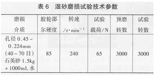 。1)濕砂橡膠輪式磨料磨損試驗(yàn)濕砂磨損試樣尺寸:57mm×25mm×12mm,濕砂磨損試驗(yàn)技術(shù)參數(shù)如表6所示。