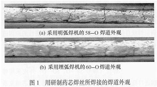同一種自保護(hù)藥芯焊絲在相同的焊接規(guī)范下由于采用的焊接設(shè)備不同,使得焊接工藝性能差異很大。58-O適合采用ZD7-1000型逆變直流明弧自動焊機(jī)焊接;60-O適合采用MZ-1000型埋弧自動焊機(jī)不加焊劑焊接,其焊道外觀如圖1所示。