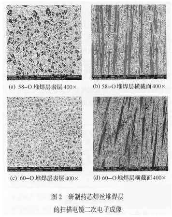 采用Quanta200型掃描電子顯微鏡對研制藥芯焊絲堆焊層表面和橫截面金相組織進(jìn)行了分析,照片如圖2所示。