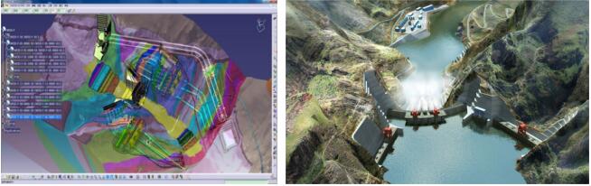 圖1烏東德水電站樞紐工程CATIA三維勘測設(shè)計模型與效果圖