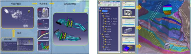 烏東德水電站樞紐工程三維勘測設(shè)計為長江設(shè)計院BIM設(shè)計先驅(qū)項目,本項目通過GOCAD讀取工程地質(zhì)數(shù)據(jù)庫,并在GOCAD中進行三維地質(zhì)建模,通過二次開發(fā)插件,將GOCAD三維地質(zhì)模型連同屬性導(dǎo)入CATIA平臺,作為樞紐布置設(shè)計上游主要數(shù)據(jù)源之一。并基于CATIA平臺通過骨架關(guān)聯(lián)設(shè)計技術(shù)與數(shù)據(jù)接口融合技術(shù)把水電工程多專業(yè)集于統(tǒng)一的數(shù)據(jù)源進行三維協(xié)同設(shè)計與應(yīng)用。