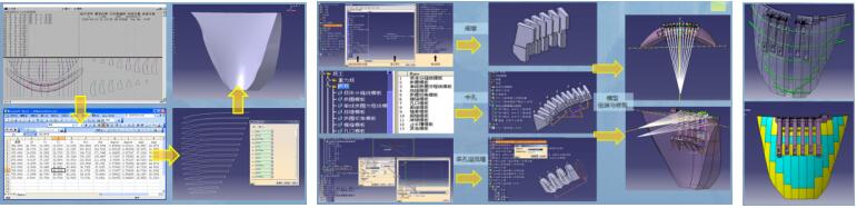 (3)壩工專業(yè)復(fù)雜形體精細(xì)化設(shè)計。通過ADAO程序進行拱壩形體方案設(shè)計,生成形體參數(shù)設(shè)計表并對接CATIA拱圈三維模板快速完成各高程拱圈曲線,擬合成拱壩基本體型。結(jié)合三維模板完成表孔、中孔、結(jié)構(gòu)分縫、混凝土分區(qū)及壩體廊道的設(shè)計與優(yōu)化,過程見圖4.