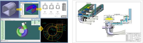 (5)結(jié)構(gòu)出圖。通過我院自主研發(fā)的CATIA水工結(jié)構(gòu)三維設(shè)計二維出圖技術(shù)解決方案,通過三維模型抽取二維圖與軸側(cè)圖,尤其是提高了復(fù)雜曲面結(jié)構(gòu)的出圖表達質(zhì)量(圖8)。