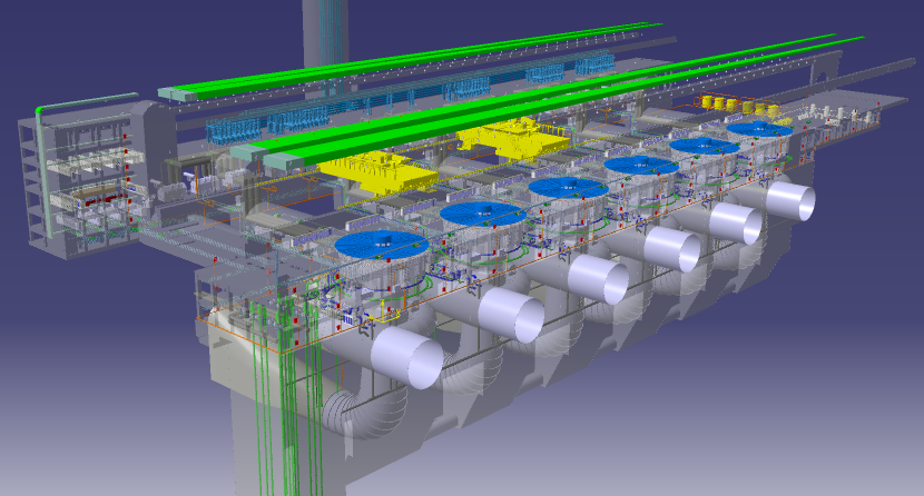 ?。?)機電(電一、電二、水機、暖通)多專業(yè)三維協(xié)同設(shè)計。機電專業(yè)參照地下式引水發(fā)電建筑物中的主廠房、調(diào)壓室、主變洞等三大洞室土建結(jié)構(gòu),調(diào)用機電標(biāo)準(zhǔn)件庫,進行機電管路和設(shè)備等綜合布置設(shè)計(圖6)。