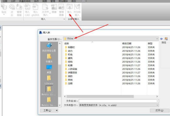 6.完成以上操作后,點(diǎn)擊Revit中“載入族”按鈕,可直接進(jìn)入China中國(guó)標(biāo)準(zhǔn)的族庫文件夾