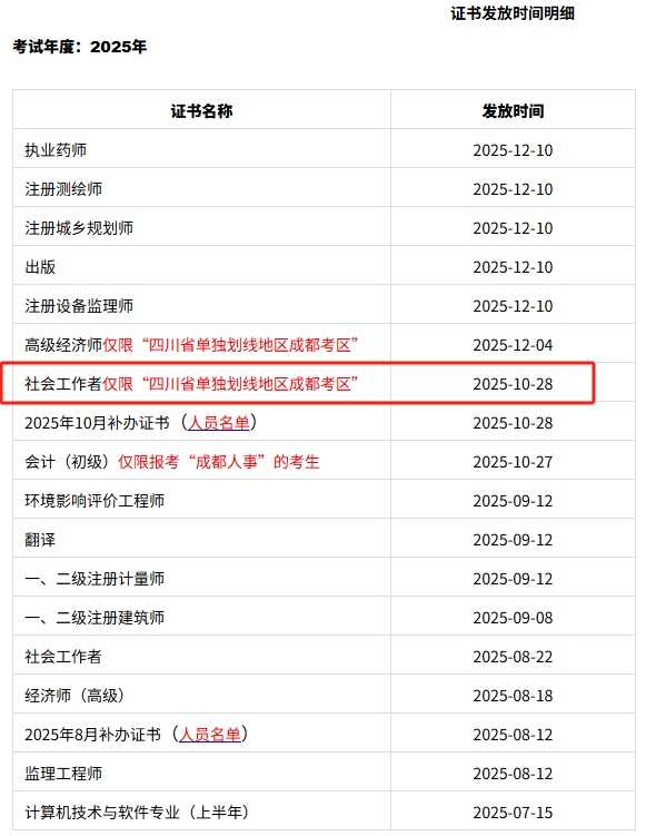 25年社會(huì)工作者僅限“四川省單獨(dú)劃線地區(qū)成都考區(qū)”領(lǐng)證通知!25年社會(huì)工作者僅限“四川省單獨(dú)劃線地區(qū)成都考區(qū)”證書已發(fā)放!