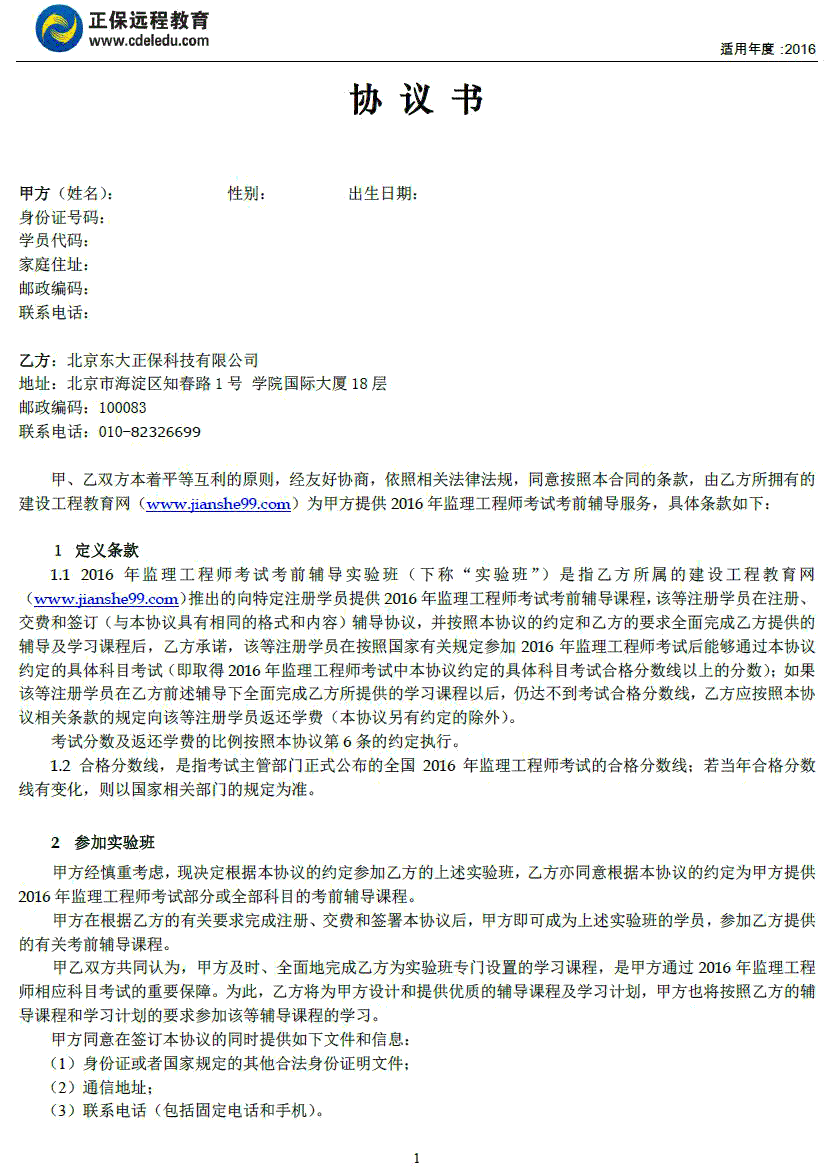 監(jiān)理工程師“實驗班”協(xié)議書