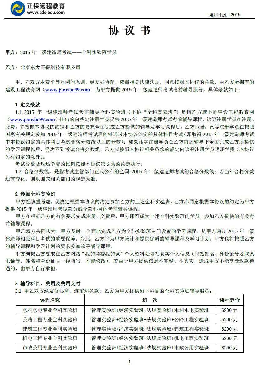 一級建造師“全科實(shí)驗(yàn)班”協(xié)議書