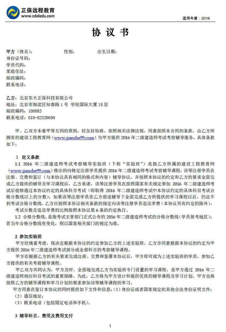 二級(jí)建造師“實(shí)驗(yàn)班”協(xié)議書