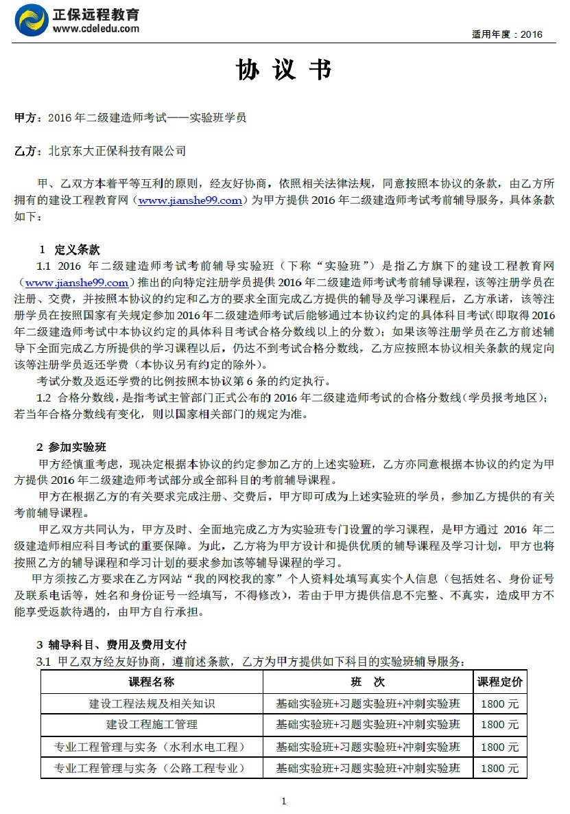 二級(jí)建造師“實(shí)驗(yàn)班”協(xié)議書