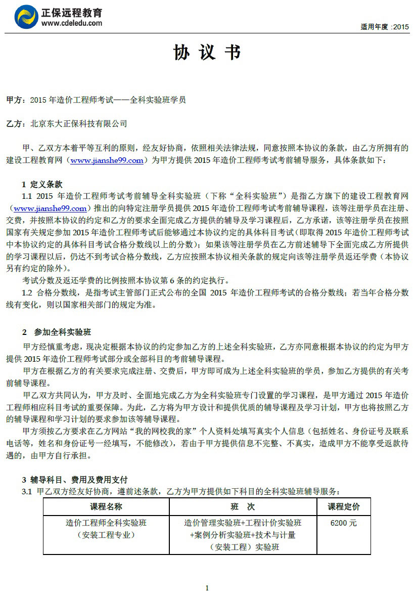 造價工程師“全科實驗班”協(xié)議書