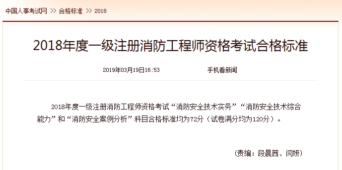 終于,2019年3月19日中國人事考試網(wǎng)公布了邢臺市2018年一級注冊消防工程師考試成績合格標準,各科目考試合格標準均為試卷滿分的60%,72分合格(試卷滿分為120分)