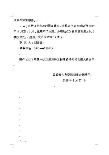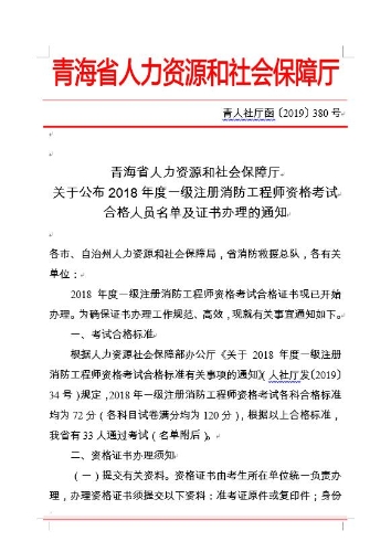 青海省人力資源和社會(huì)保障廳關(guān)于公布2018年度一級注冊消防工程師資格考試合格人員名單及證書辦理的通知