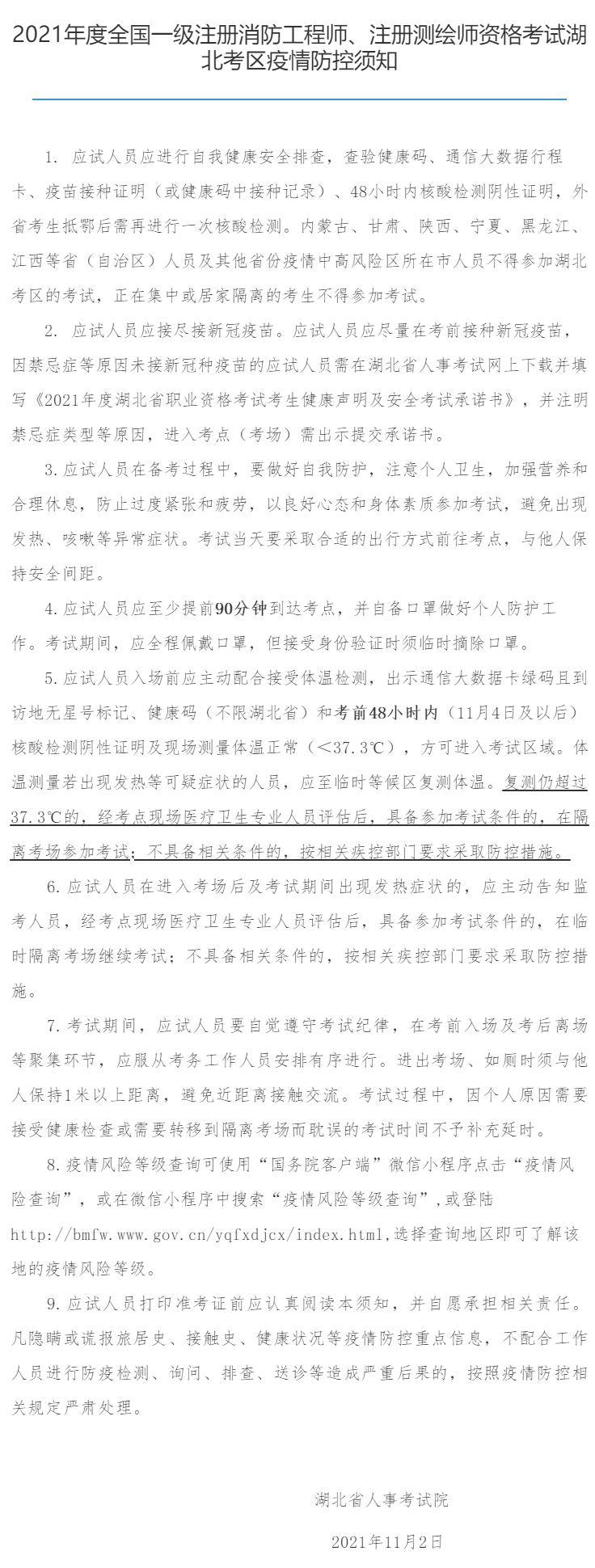 2021年度全國一級注冊消防工程師專業(yè)資格考試湖北考區(qū)疫情防控須知