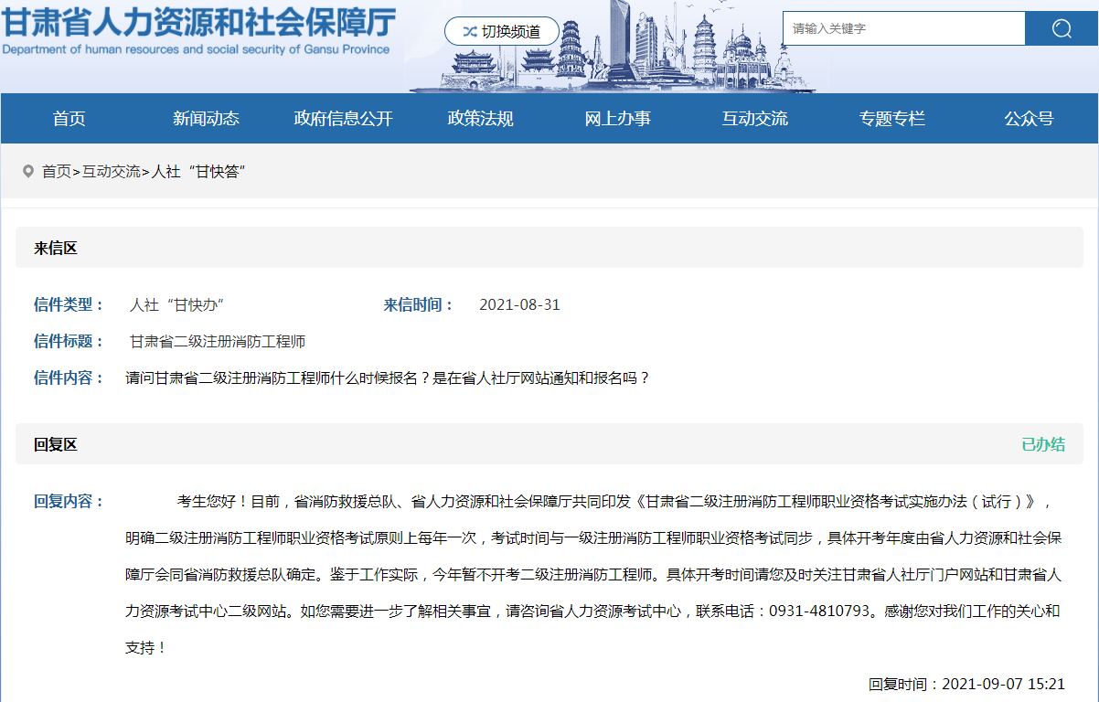 信件內(nèi)容:請問甘肅省二級注冊消防工程師什么時候報名?是在省人社廳網(wǎng)站通知和報名嗎?