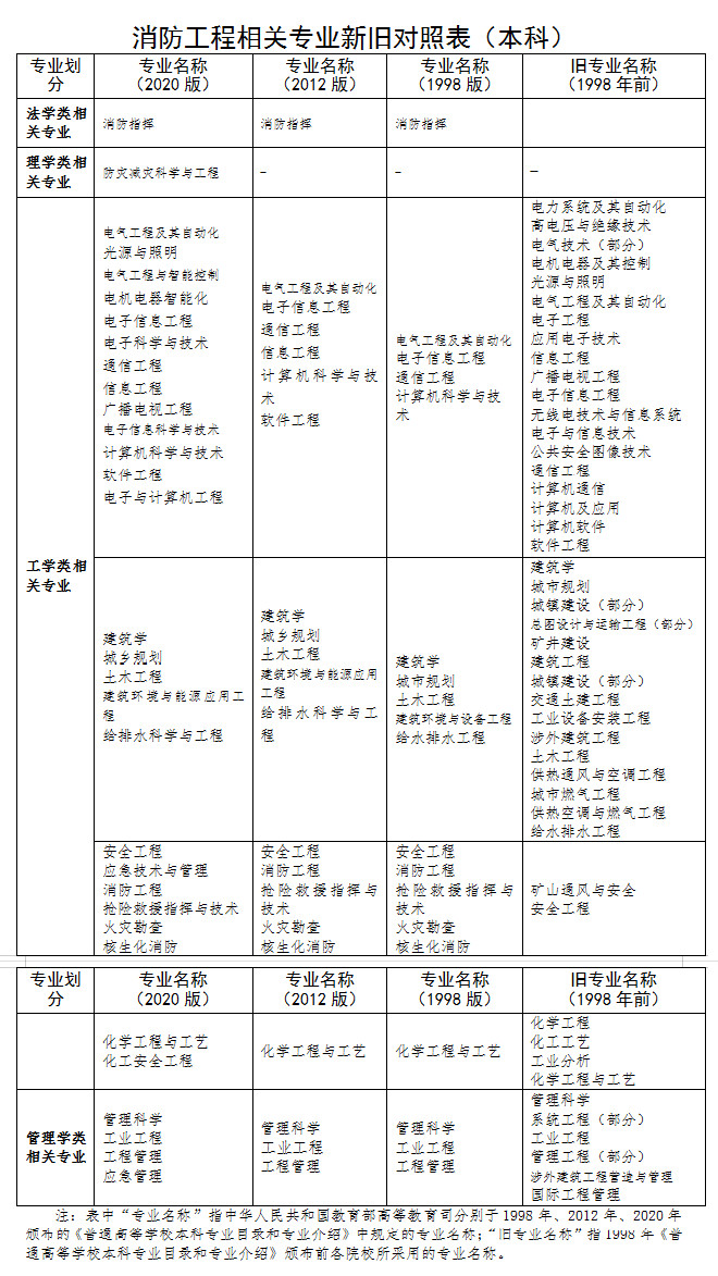 接上級部門通知,應急管理部消防救援局對《關于印發(fā)注冊消防工程師制度暫行規(guī)定和注冊消防工程師資格考試實施辦法及注冊消防工程師資格考核認定辦法的通知》(人社部發(fā)〔2012〕56號)附件1中“消防工程相關專業(yè)新舊對照表”增加了相關內(nèi)容。