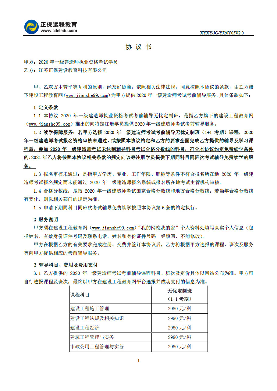 2020年一級建造師無憂定制班續(xù)學(xué)協(xié)議書