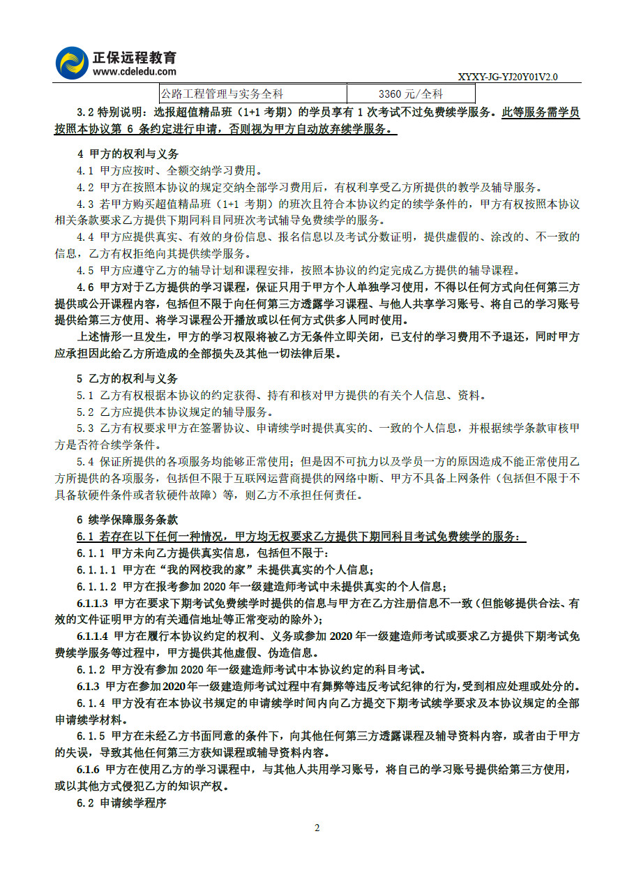 2020年一級(jí)建造師超值精品班續(xù)學(xué)協(xié)議書(shū)