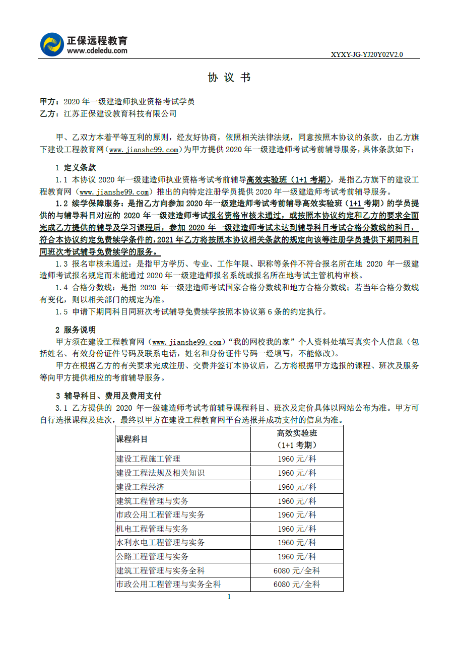 2020年一級(jí)建造師高效實(shí)驗(yàn)班續(xù)學(xué)協(xié)議書