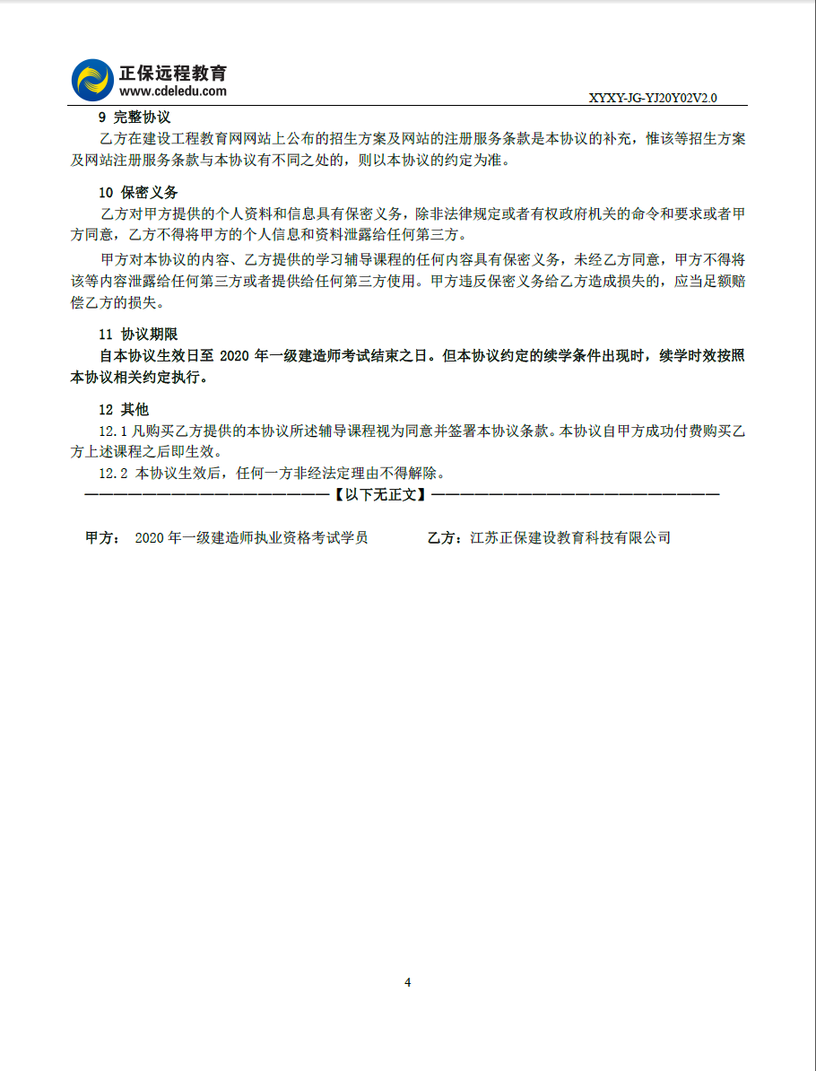 2020年一級建造師高效實驗班續(xù)學協(xié)議書