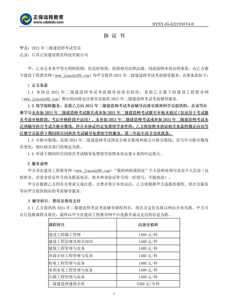 2021年二級建造師高效實驗班協(xié)議書