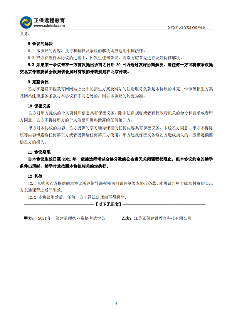 2021年一級建造師尊享無憂班續(xù)學(xué)協(xié)議書