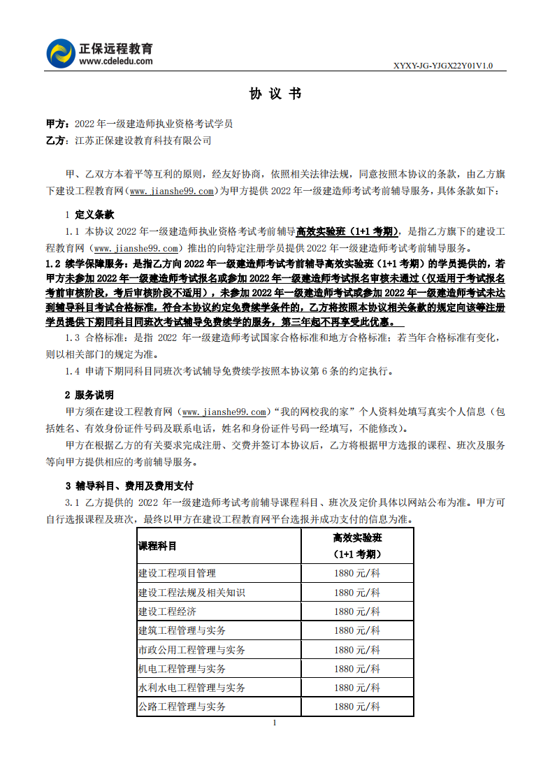 2022年一級建造師高效實(shí)驗(yàn)班續(xù)學(xué)協(xié)議書