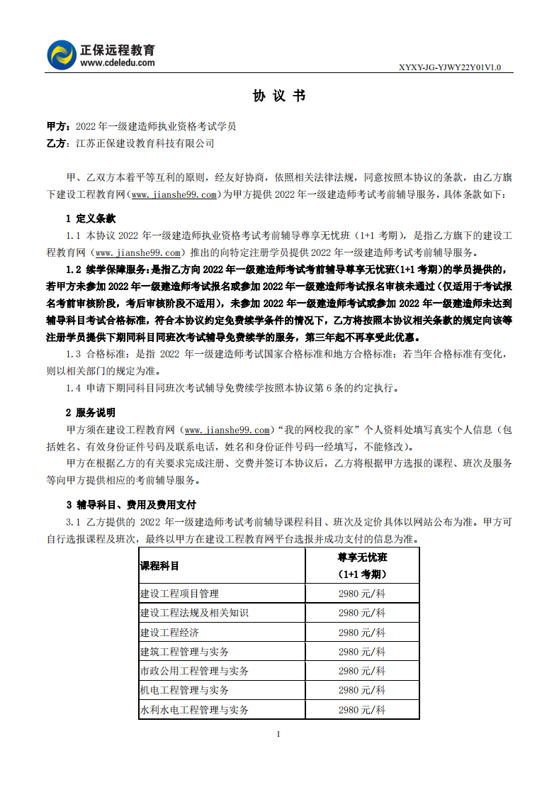2022年一級(jí)建造師尊享無(wú)憂班續(xù)學(xué)協(xié)議書