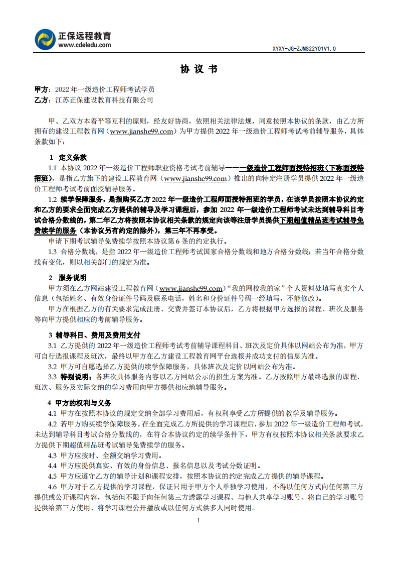 一級造價師面授特招班協(xié)議書