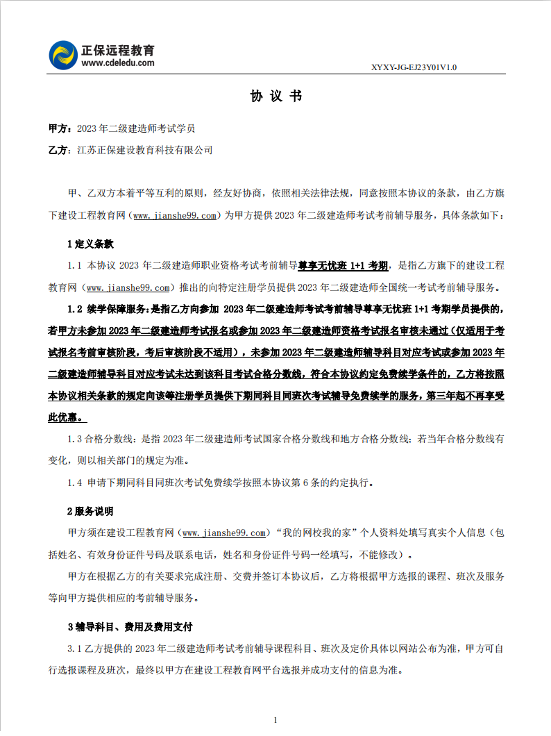 2023年二級建造師尊享無憂班1+1考期協(xié)議書