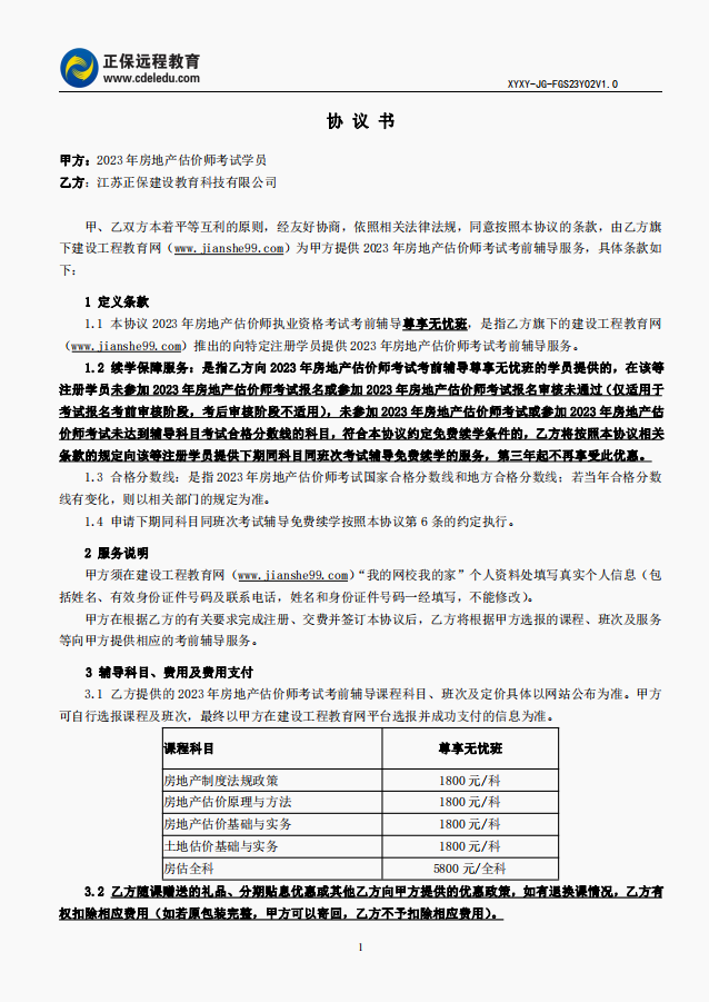 2023年房地產(chǎn)估價師尊享無憂班協(xié)議書