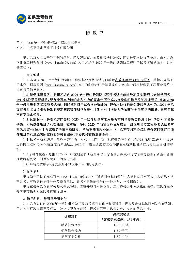 2020年一級(jí)注冊(cè)消防工程師高效實(shí)驗(yàn)班協(xié)議書