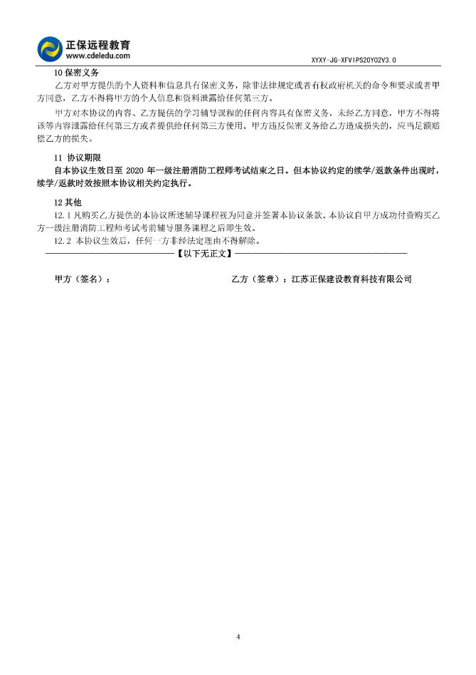 2020年一級(jí)注冊(cè)消防工程師VIP特訓(xùn)班協(xié)議書
