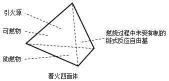 研究表明,可燃物的多數(shù)氧化反應(yīng)不是直接進(jìn)行的,而是通過自由基團(tuán)和原子這些中間產(chǎn)物瞬間進(jìn)行的循環(huán)鏈?zhǔn)椒磻?yīng)。當(dāng)可燃物受熱時(shí),不僅會(huì)發(fā)生氣化,而且可燃物的分子會(huì)裂解為簡(jiǎn)單分子,這些分子中原子間的共價(jià)鍵發(fā)生斷裂,生成自由基,從而使燃燒得以持續(xù)。鏈?zhǔn)椒磻?yīng)過程經(jīng)過鏈引發(fā)、鏈傳遞和鏈終止三個(gè)階段。可見,自由基的鏈?zhǔn)椒磻?yīng)是燃燒反應(yīng)的實(shí)質(zhì),光和熱是燃燒過程中的物理現(xiàn)象。對(duì)于多數(shù)有焰燃燒而言,其燃燒過程中存在未受抑制的自由基作為中間體。因此,可以用著火四面體(如圖1-1-2所示)來表示有焰燃燒的四個(gè)條件, 即可燃物、助燃物、引火源和鏈?zhǔn)椒磻?yīng)自由基,分別對(duì)應(yīng)圖1-1-2中四面體的四個(gè)面。