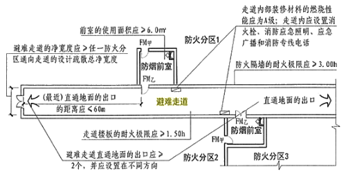 避難走道是指設(shè)置防煙設(shè)施且兩側(cè)設(shè)置耐火極限不低于3.00h的防火隔墻,用于人員安全通行至室外的走道。