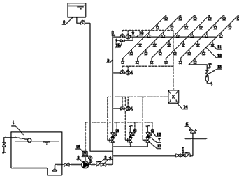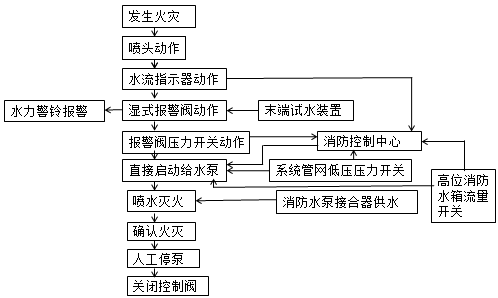 此時,壓力水通過濕式報警閥流向管網(wǎng),同時打開通向水力警鈴的通道,延遲器充滿水后,水力警鈴發(fā)出聲響警報,壓力開關(guān)動作并輸出啟動供水泵的信號。供水泵投入運(yùn)行后,完成系統(tǒng)的啟動過程。