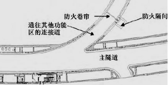用于車輛疏散的輔助通道、橫向聯(lián)絡(luò)道與隧道連接處應(yīng)采用耐火極限不低于3.0h的防火卷簾進(jìn)行分隔。
