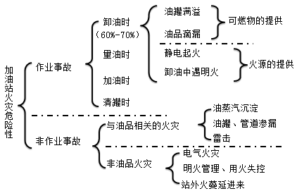 由于加油站收發(fā)的油品為汽油和柴油,加油站火災(zāi)除具備一般火災(zāi)的共性外,還具有油品易燃燒和油氣混合氣易爆炸的特殊性,若管理不當(dāng),容易發(fā)生火災(zāi)爆炸事故。加油站火災(zāi)事故,按其發(fā)生的原因不同可分為作業(yè)事故和非作業(yè)事故兩大類。