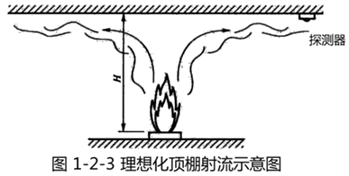 (2)頂棚射流。當煙氣羽流撞擊到房間的頂棚后,沿頂棚水平運動,形成一個較薄的頂棚射流層,稱為頂棚射流。由于它的作用,使安裝在頂棚上的感煙探測器、感溫探測器和灑水噴頭產生響應,實現(xiàn)自動報警和噴淋滅火。