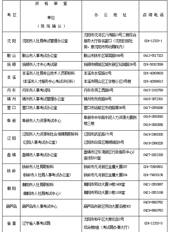 (三)報(bào)名時(shí),我省報(bào)考人員(不含大連考生)請(qǐng)選擇“遼寧省”考區(qū)。駐沈的中、省直單位報(bào)考人員應(yīng)選擇“省直”審核點(diǎn),其他報(bào)考人員均按屬地化管理原則,選擇單位所在市為報(bào)名資格審核點(diǎn)。報(bào)名有關(guān)事宜咨詢電話詳見(jiàn)附件1。