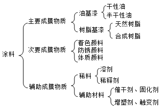 (1)涂料的基本組成。涂料大體上可分為三部分,即主要成膜物質(zhì)、次要成膜物質(zhì)和輔助成膜物質(zhì)(03、09、16)。
