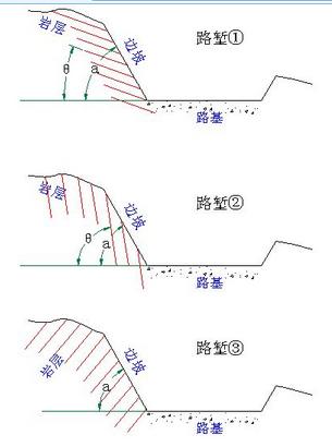 低于原地面的挖方路基稱為路塹?!吧盥穳q”即挖的比較深的“路塹”。高邊坡是指土方開(kāi)挖高度≥20m的邊坡。“深路塹”當(dāng)然對(duì)“高邊坡”。“邊坡傾角”指的就是坡面和水平面的夾角。記為α。根據(jù)幾何關(guān)系:tan α=H/L(高度H與寬度之比L)。邊坡傾角α>巖層傾角θ。