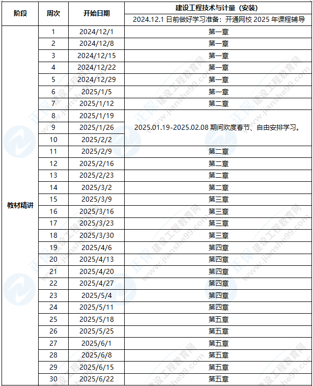 1、整體進(jìn)度說明:本計(jì)劃表從2024年12月1日開始執(zhí)行,計(jì)劃于2025年6月30日結(jié)束,共計(jì)30周;其中:教材精講階段安排27周,春節(jié)調(diào)整階段3周。學(xué)員可根據(jù)本表的提示,結(jié)合自己的工作,學(xué)習(xí)情況進(jìn)行細(xì)化,并按網(wǎng)校要求完成聽課、做題的學(xué)習(xí)任務(wù),基本可滿足考試需要。