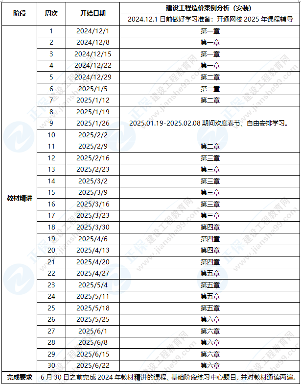 1、整體進(jìn)度說明:本計(jì)劃表從2024年12月1日開始執(zhí)行,計(jì)劃于2025年6月30日結(jié)束,共計(jì)30周;其中:教材精講階段安排27周,春節(jié)調(diào)整階段3周。學(xué)員可根據(jù)本表的提示,結(jié)合自己的工作,學(xué)習(xí)情況進(jìn)行細(xì)化,并按網(wǎng)校要求完成聽課、做題的學(xué)習(xí)任務(wù),基本可滿足考試需要。