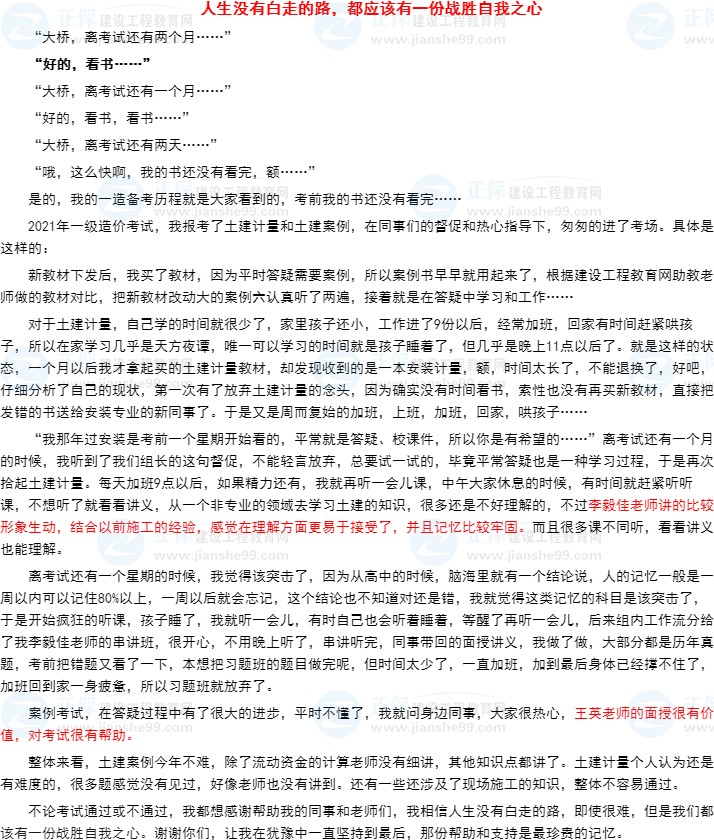 2021年一級(jí)造價(jià)師考試已經(jīng)結(jié)束,建設(shè)工程教育網(wǎng)在這個(gè)考試結(jié)束之際,推出了“我的造價(jià)備考之路”有獎(jiǎng)?wù)魑幕顒?dòng)!你投稿我發(fā)獎(jiǎng),在這個(gè)考完的放松時(shí)刻,讓你說出你的備考心得,分享你的備考醫(yī)路,在此小編為大家整理參與活動(dòng)的投稿內(nèi)容,一起分享大家的備考感悟與心得: